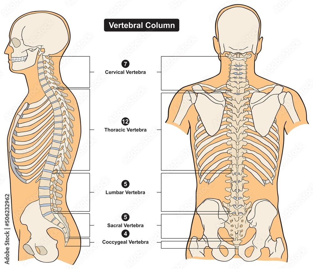Vertebral Column Of Human Body Anatomy Infographic Diagram Medical Science Education Spine Vertebra Cervical Thoracic Lumbar Sacral Coccygeal Skull Ribs Sternum Hipbone Skeleton Bone Vector Stock Vector Adobe Stock